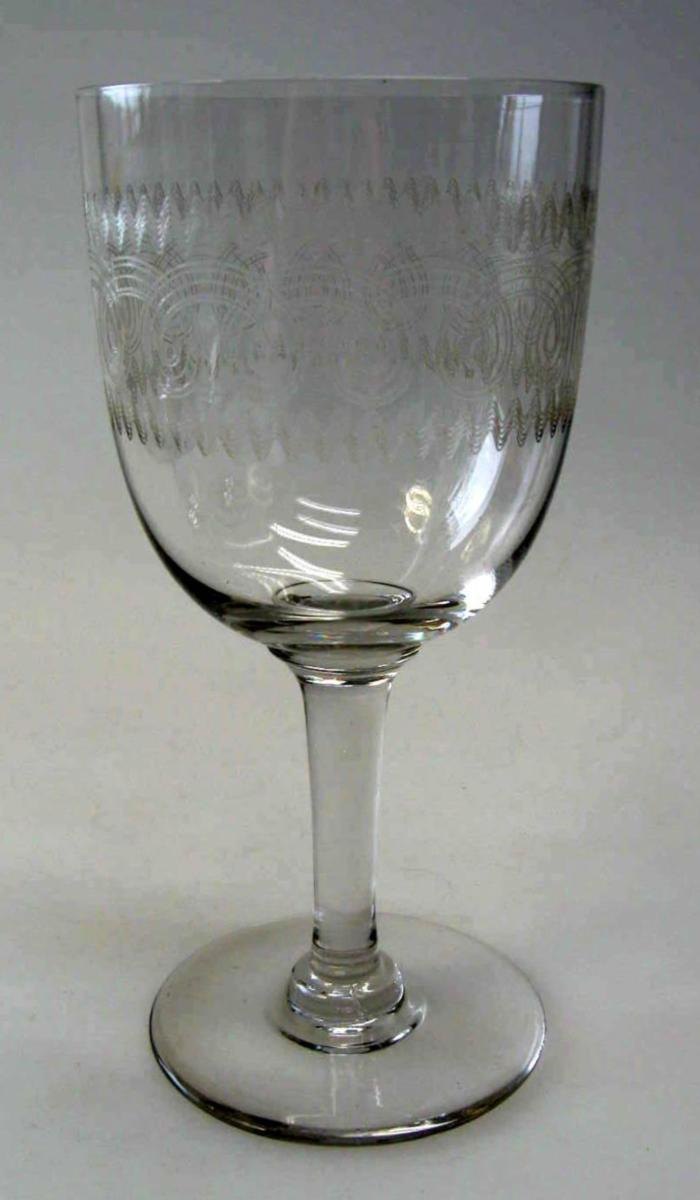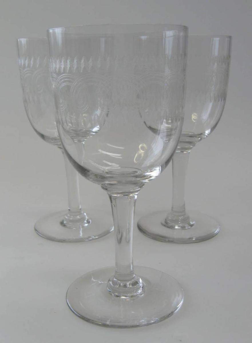 Vinglas med glat stik og med guillocheret dekoration på kumme, o. 1910. H.: 16,5 cm. Pt. 6 stk.