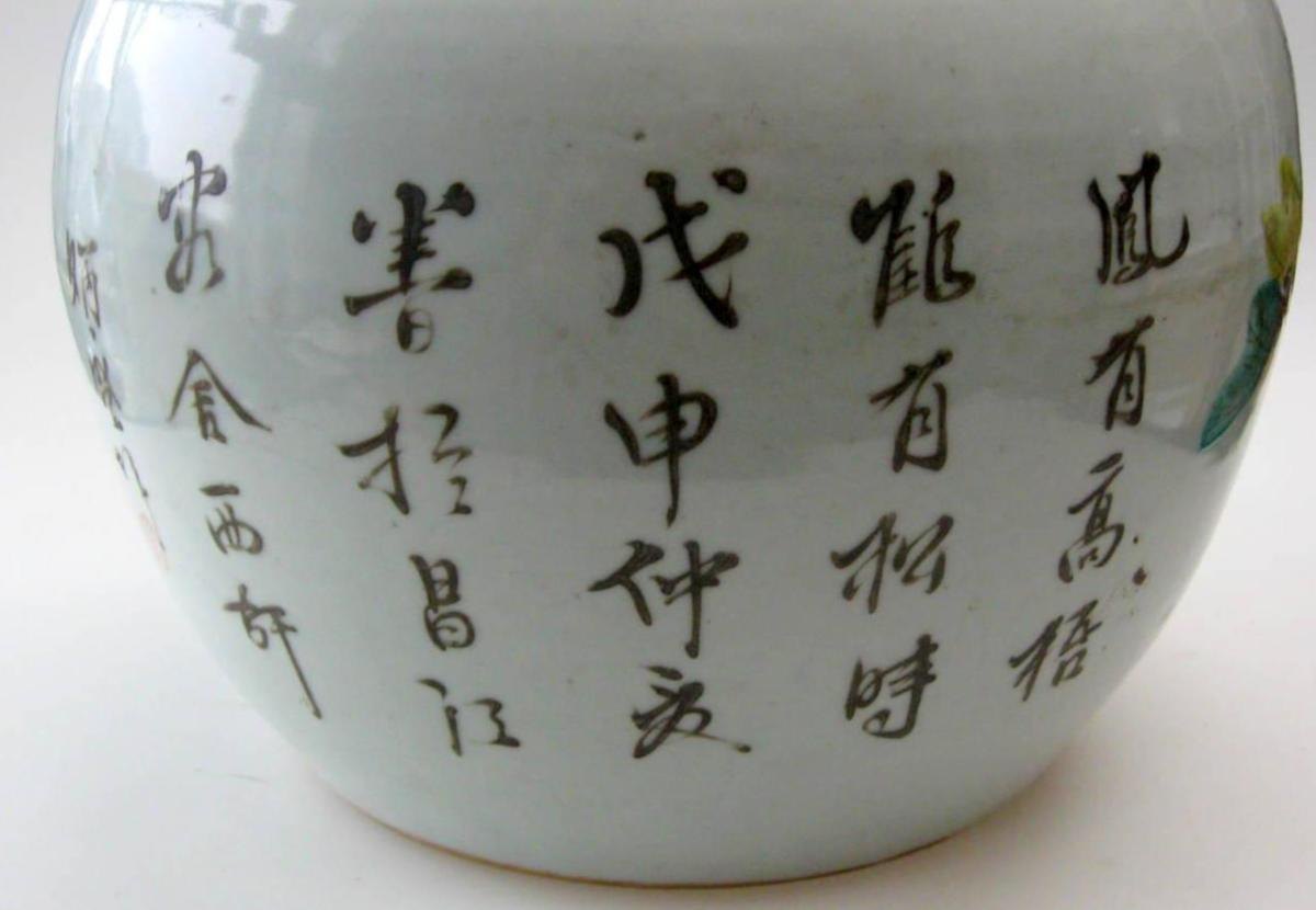 Kinesisk bojan af porcelæn, 19. årh. Polykrom dekoration af trane i træ. Med skriftstegn. På base af træ. Signeret. H,: 21 cm.