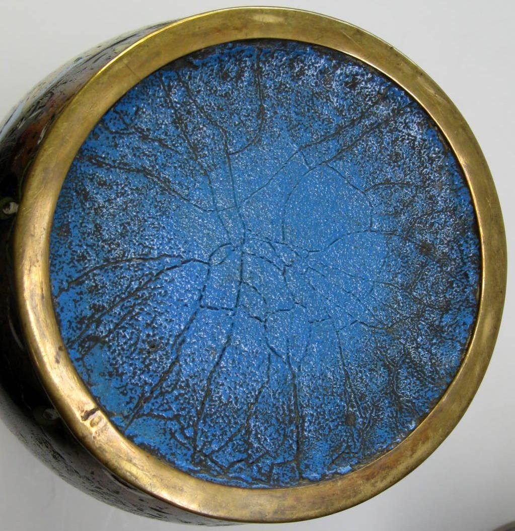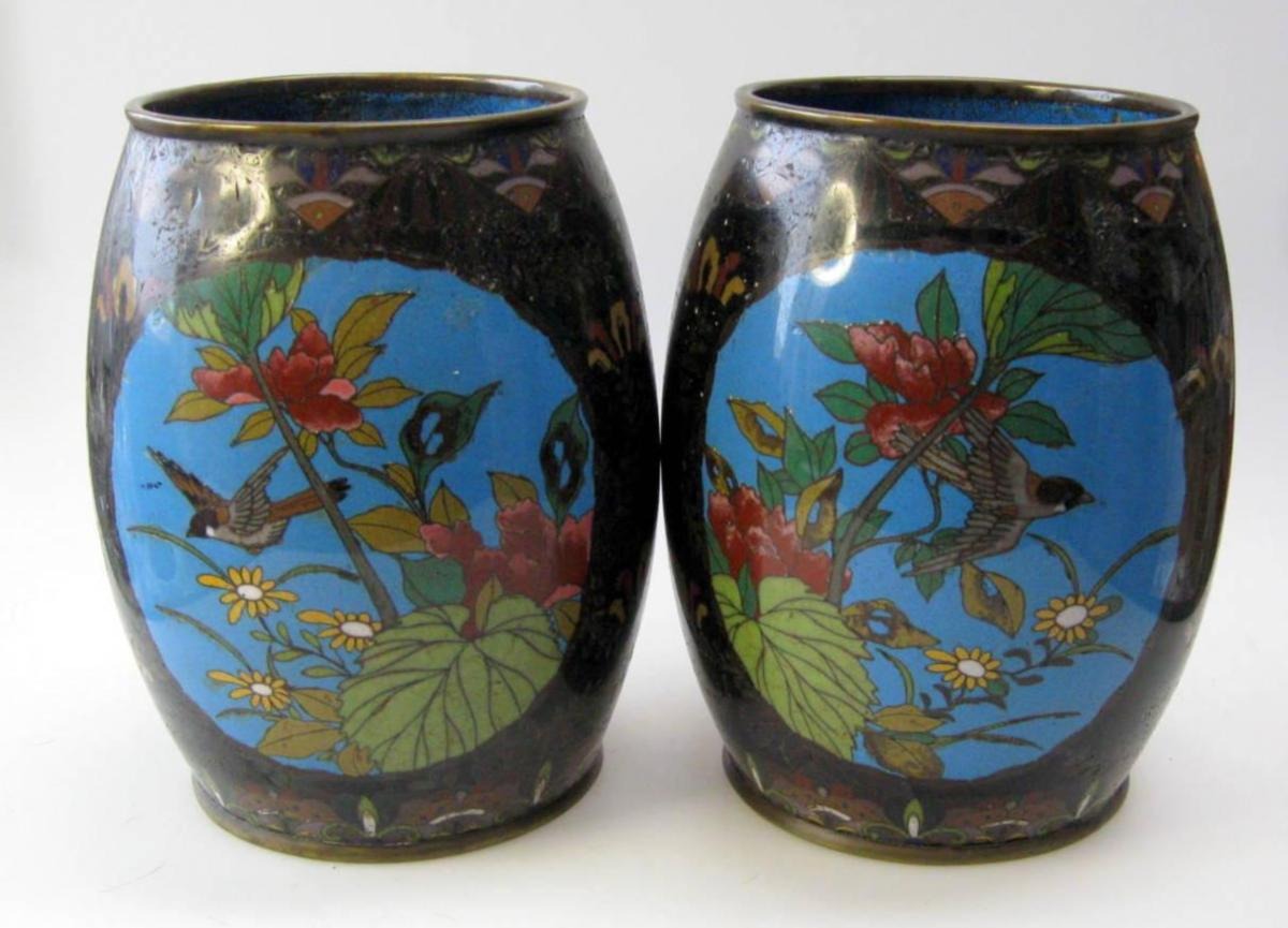Par kinesiske cloissonne krukker, 19. årh. Overvejende dekoreret i blåt og sort. Dekoreret med fugle i blomsterbuske. H.: 19 cm.