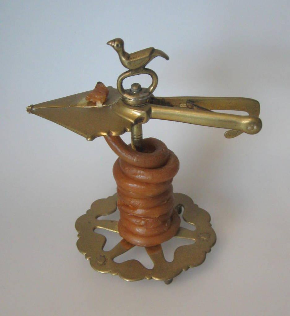 Voksstabelholder (klemstage) i messing, 18. årh. Gennembrudt pladefod med trefod. Topfigur i form af hane. H: 16 cm. Flot stand!