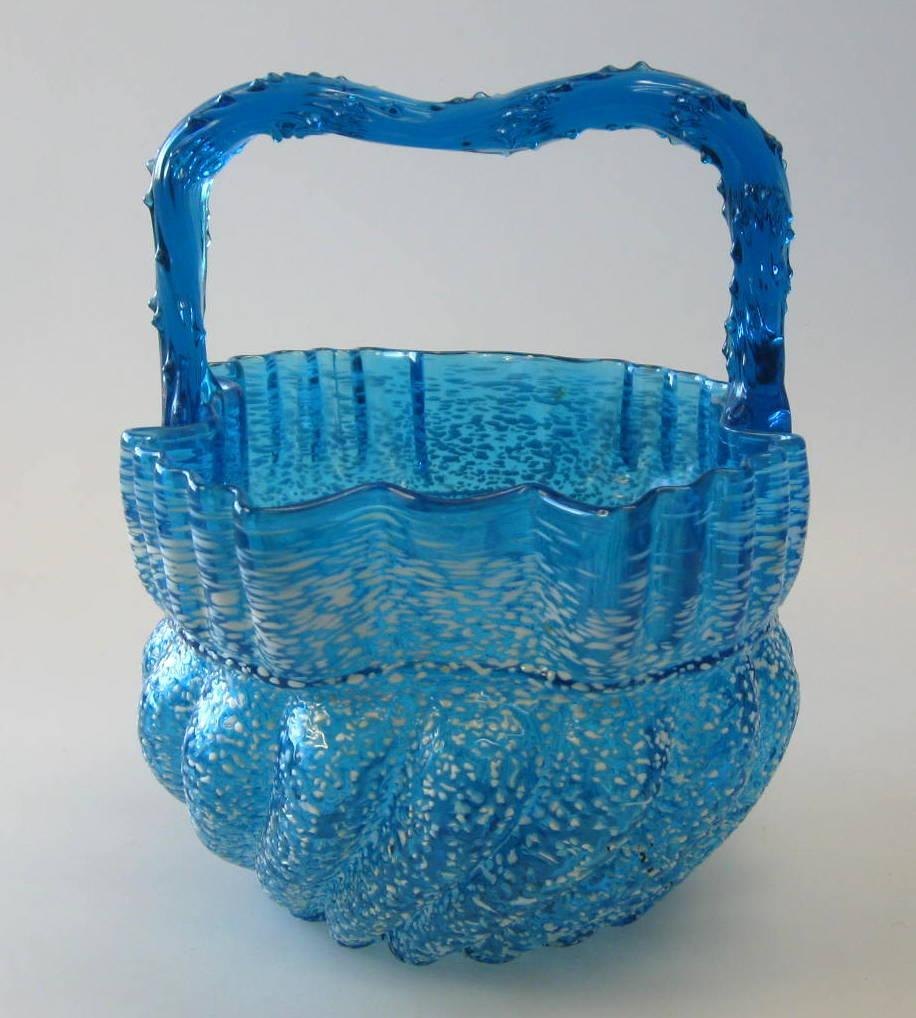 Glasskål med hank, i sø blåt glas, o. 1900 - antagelig Danmark. I det blå glas indlagtehvide prikker. Flæset kant og hank udformet som gren med knaster. H.: 16 cm. Dia.: 14,5 cm. Virkelig flot og sjælden!