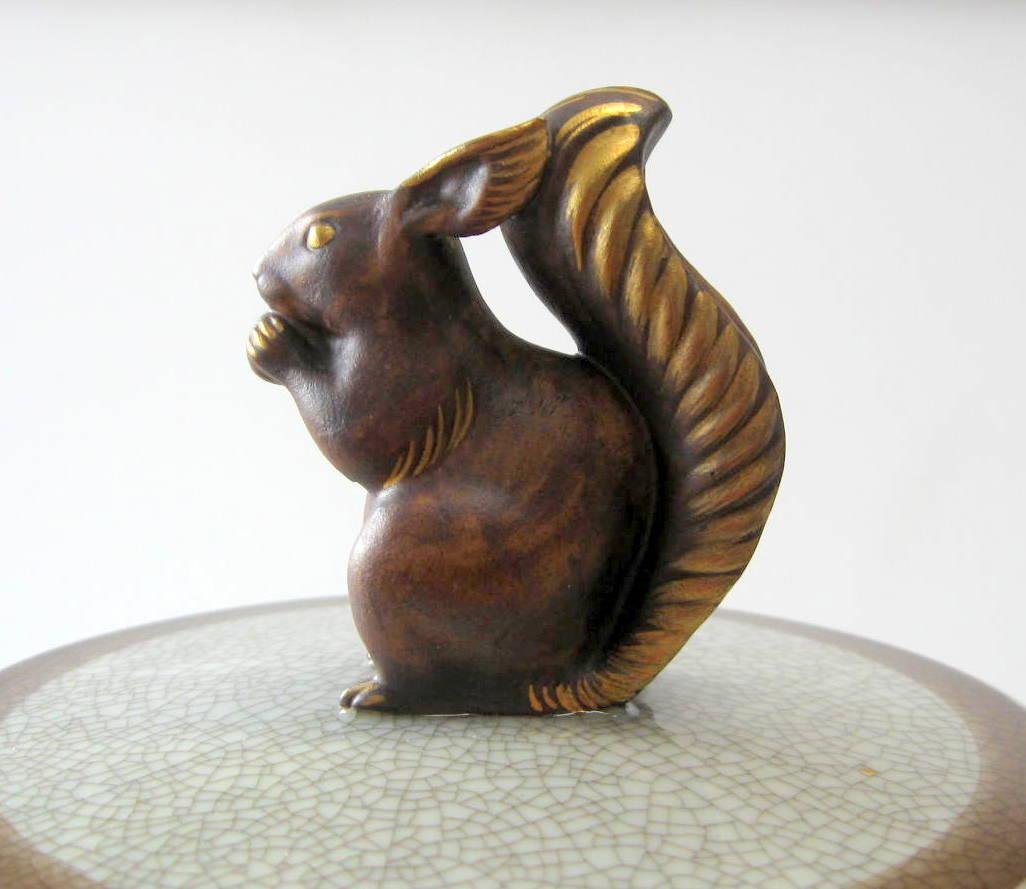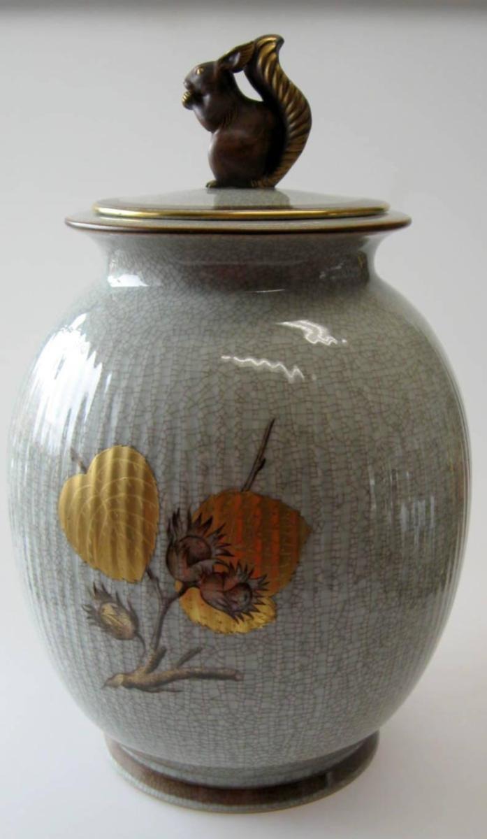 Craquelle vase, Den kongelige Porcelænsfabrik, dekoreret med nødder og egern. Riflet korpus med låg med figur i form af et egern med en nød. Dekoration i brunt og forgyldning. H.: 32 cm. 1. sortering. Stemplet. no. 649/2416. Fantastik flot stand!