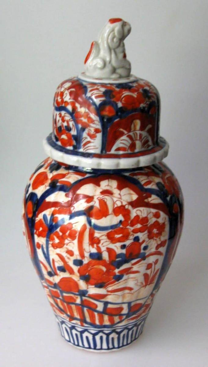 Imari lågkrukke, 19. årh. Japan. Mørkeblå underglasur med dekoreret med blåt, rødt og orange. Med løve på låg. H.: 27 cm.
