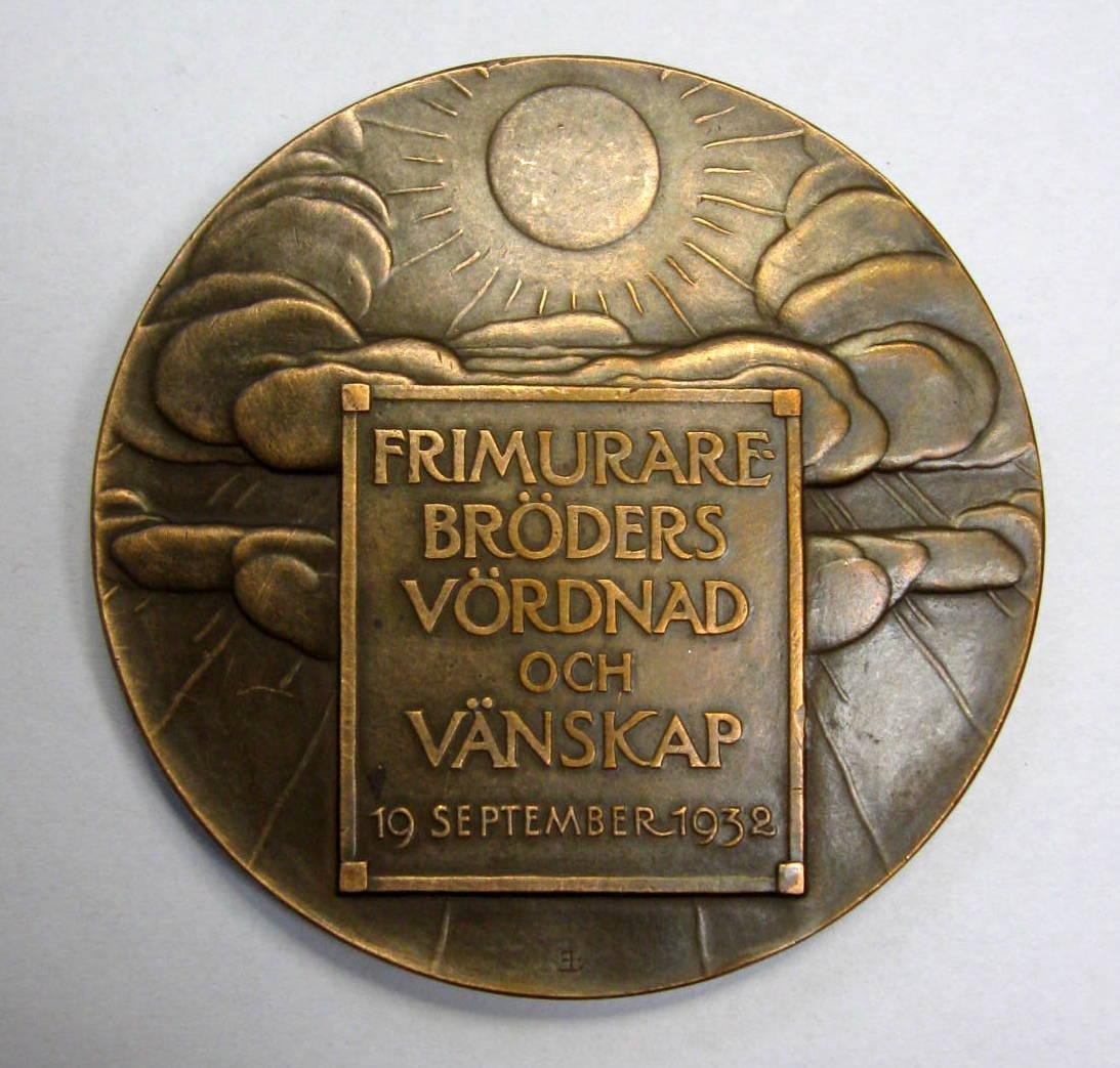 Svensk frimurerorden i bronze. Arvid Lindman medaljen. Arvid Lindmann var svensk statsminister og frimurer. I frimurerordenen var han seglbevarer og kansler. Medaljen er udført af Erik LIndberg. Tekst på medaljen.: Arvid Lindman IX prov. kansler. På bagsiden følgende tekst: "Frimurare Bröders Vördnad og vänskap. 19. september 1932. Dia.: 5,6 cm. Lindman omkom ved en flyveulykke ved Corydon i den sydlige del af London den 9. december 1936, hvor han var frimurer repræsentant.