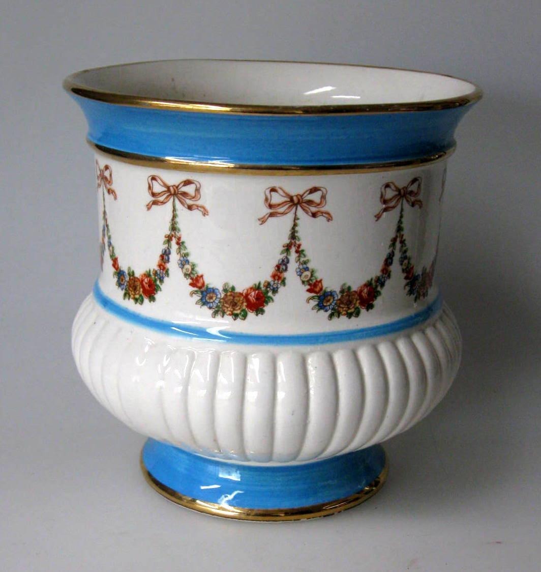 Italiensk urtepotte, 20. årh. Dekoreret med strøblomster i overføringsteknik, forgyldninger og turkis. Stemplet.: SSF, Made in Italy. H.: 14 cm.