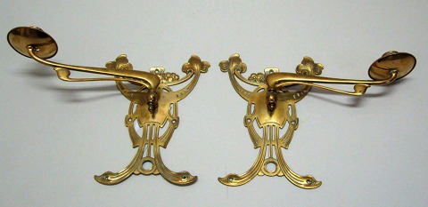 Par art nouveau væglampetter, o. 1900, i messing. Dekoreret med blomster og plantedele. H.: 20,5 cm. B.: 15,6 cm. D.: 23 cm. Har været monteret til el.