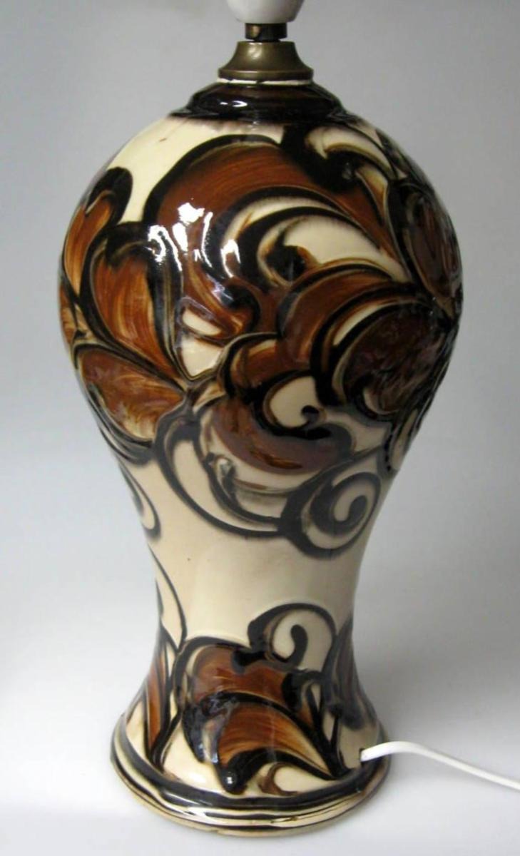 Lampefod, Dagnæs Keramik, 1930'erne. Cremefarvet bund med dekorationer i sort og brunt. Overglaseret. Stemplet: DK. H.: 33 cm. til el montering. Fin stand!