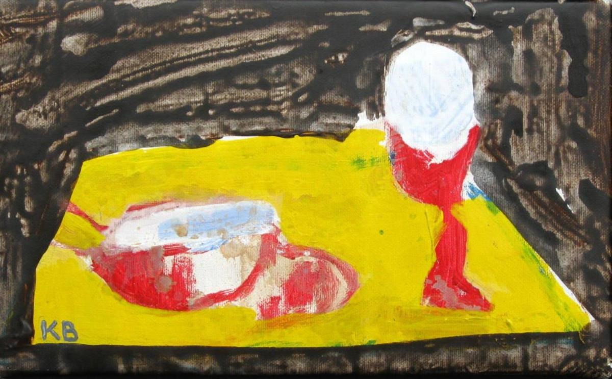 Bahnsen, Klaus (1952 - ) Danmark: Morgen mad. Acryl på lærred. Signeret: Monogram. 18 x 29 cm.