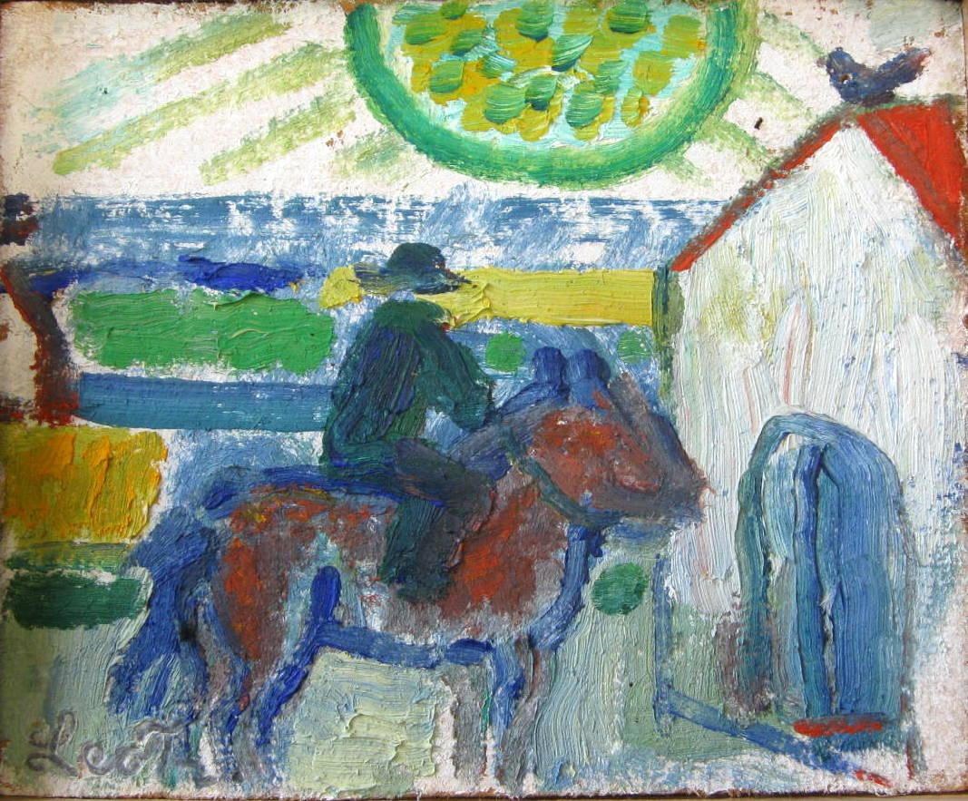 Thellefsen, Leo (1909 - 1997) Danmark: Hest og grøn sol. Olie på blød masonit. 13 x 16 cm. Signeret Leo T.