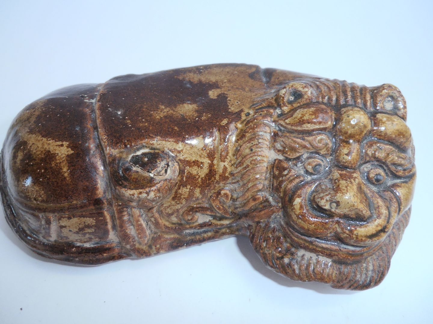 Løveskulptur af keramik m. brun glasur, Kina ca. 1880.