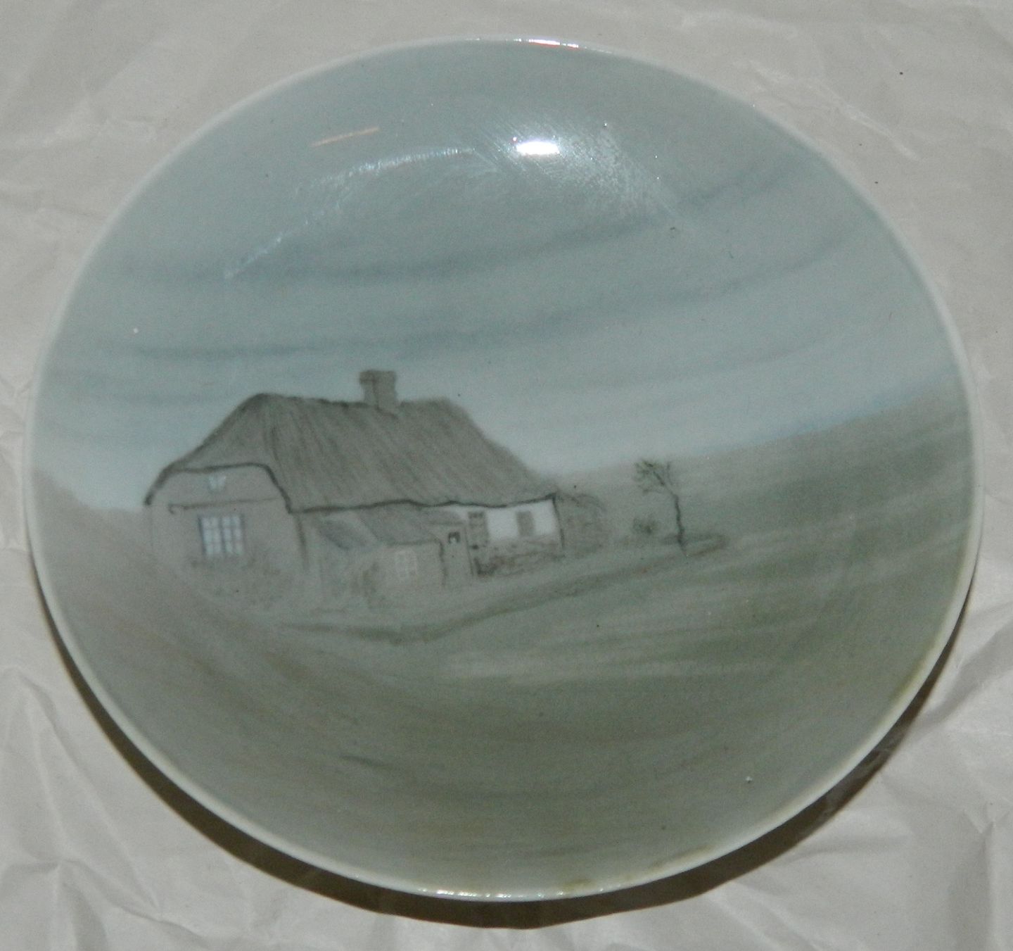 Platte i porcelæn fra Bing & Grøndahl. Dekoreret med landsted omgivet af marker af Margrethe Hyldahl (1881-1963). Platten fremstår i god stand uden skader eller reparationer. 2. sortering. 13 cm i diameter.