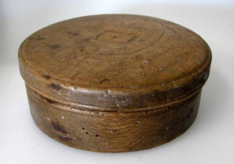 Dansk træbeholder, 18. årh. Egetræ. Med fladt låg. Med indrisninger på over- og underside - måske bomærke for ejeren eller manden, der lavede den. H.: 4,5 cm. Dia.: 12 cm. En del af kanten mangler.