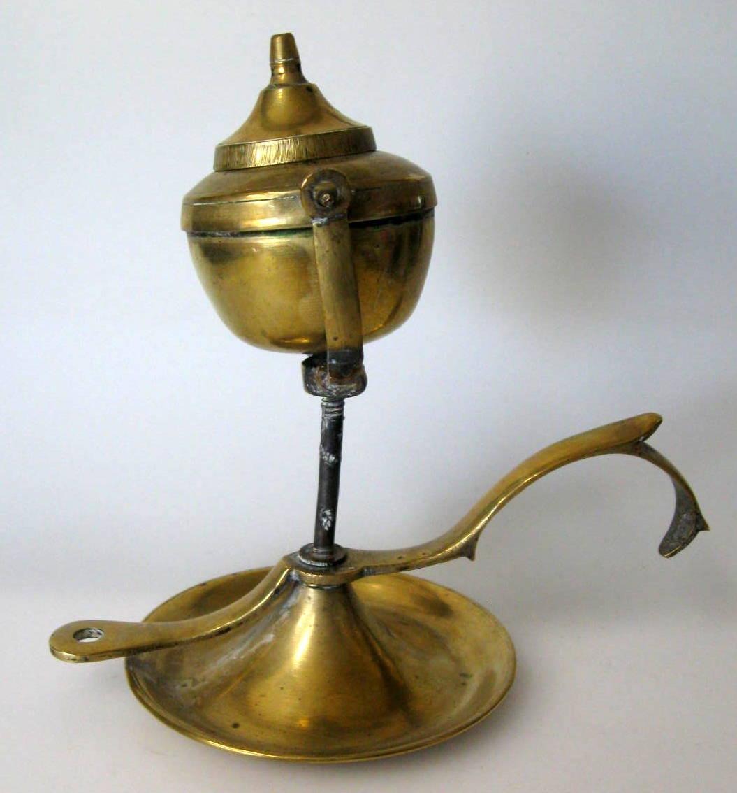 Antique Danish oil lamp, 19th century. Round foot, handles and fittings; the central rod of iron. Round oil container with a lid. H .: 15 cm.