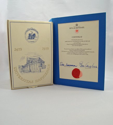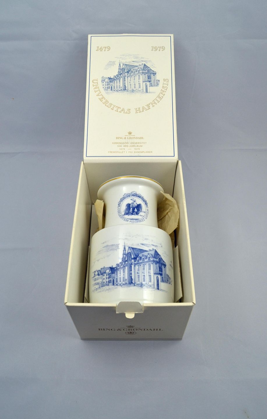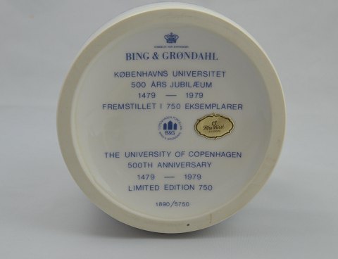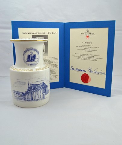Københavns Universitets 500 års jubilæum. Vasen nr. 1890/5750 er fra Bing og Grøndal. Med vasen følger certifikat og original boks. Højde: 18 cm. Ø: 10 cm.