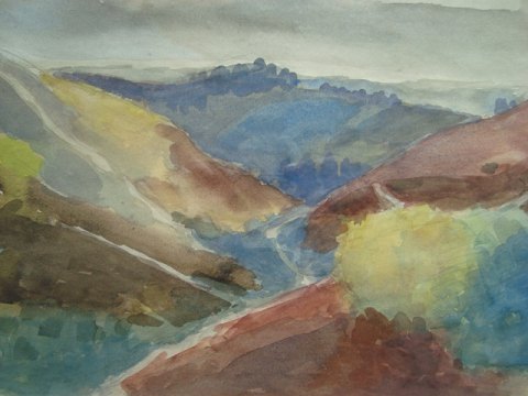 Akvarel af Palle Kierulf - Parti fra Rebild Bakker, efterår 1953