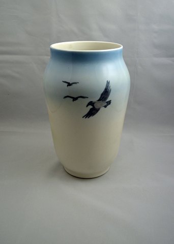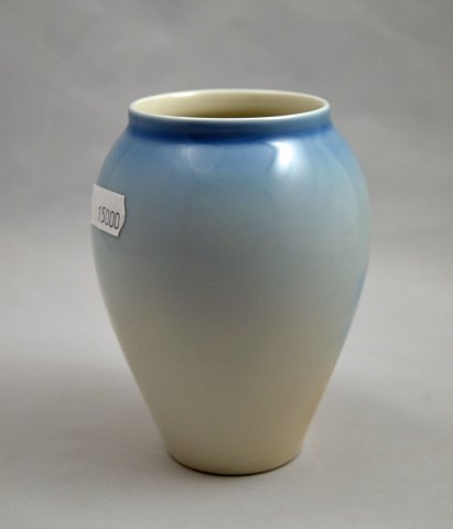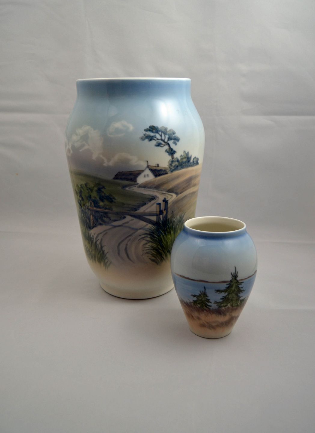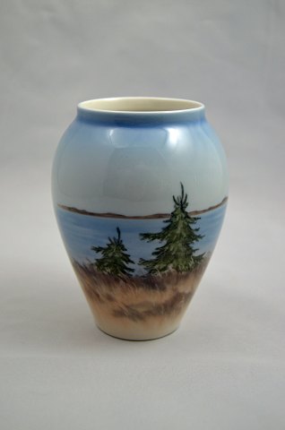 Vase med motiv af hus. H: 26,5 cm. Ø: 15,5 cm. Pris: 1250 kr.