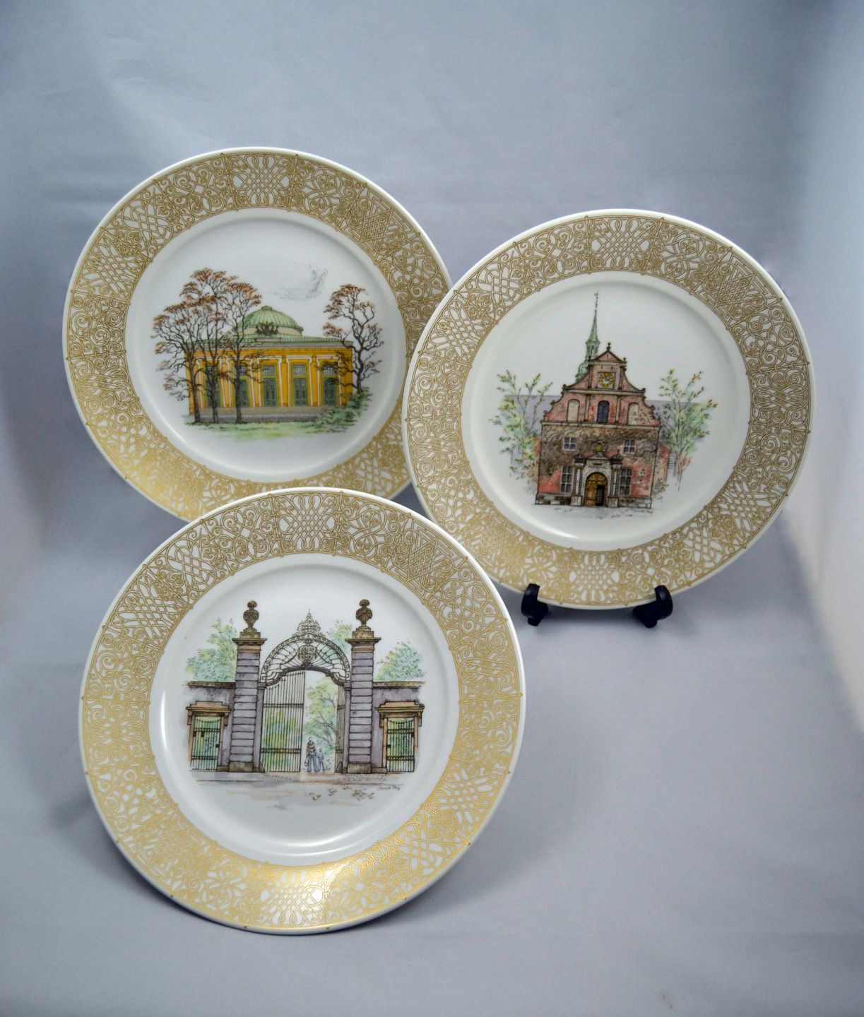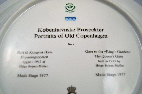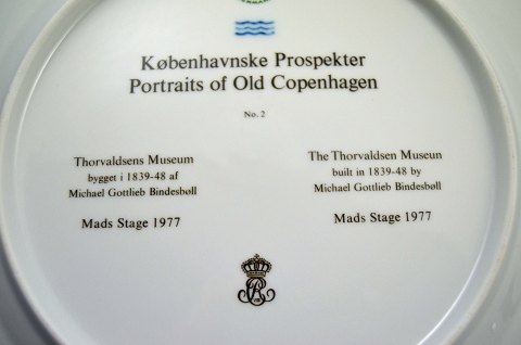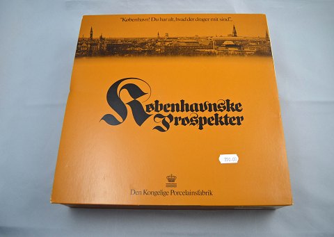 Platter fra Royal Copenhagen med motiver af Københavnske prospekter. Serien 'Københavnske prospekter' består af 12 platter/tallerkner, som hver især viser et motiv af et betydningsfuld historisk bygningsværk beliggende i København. Motiverne er tegnet af Mads Stage i 1977.