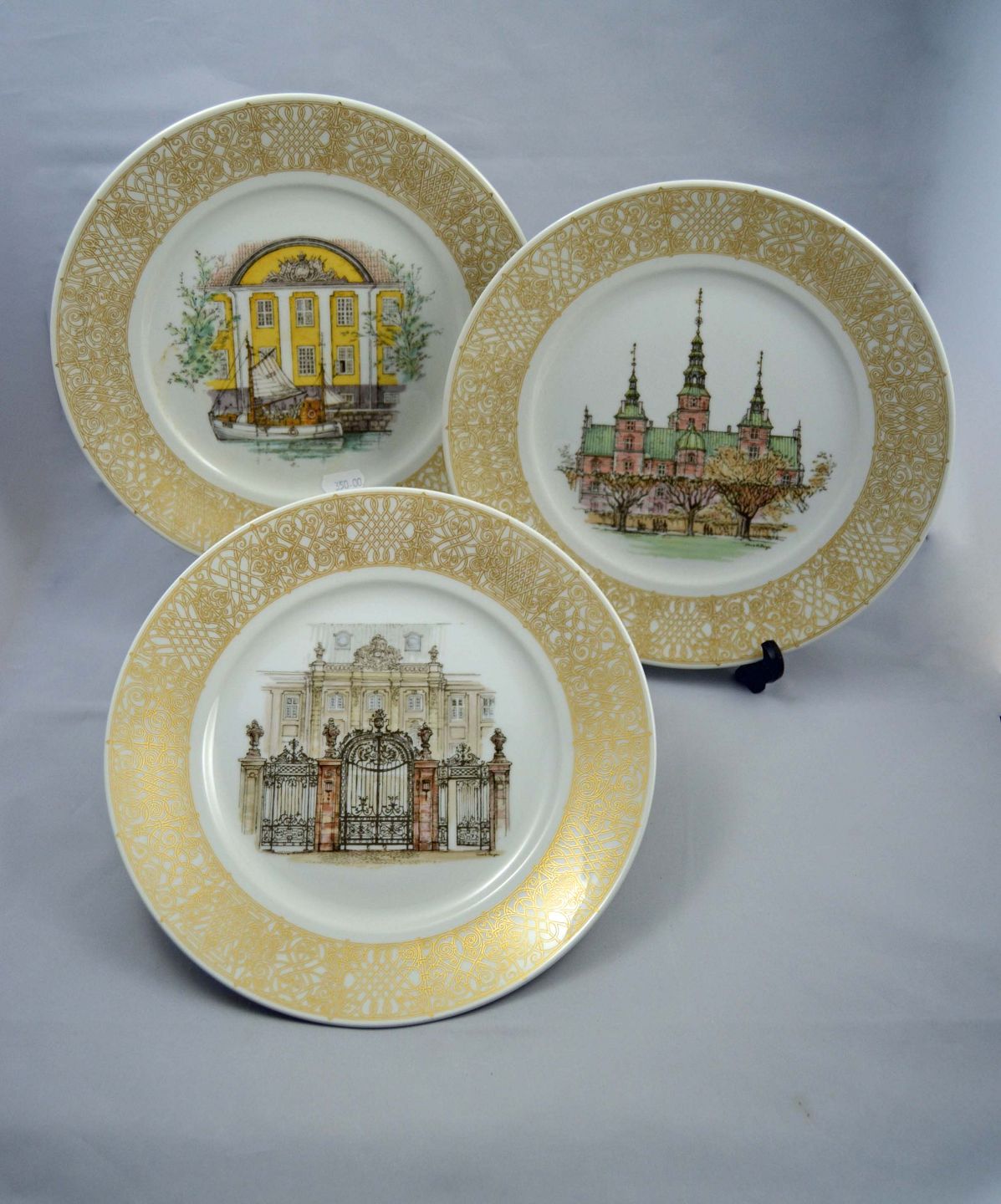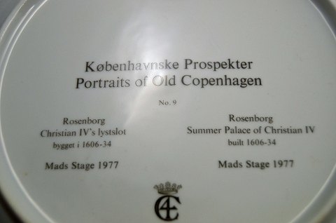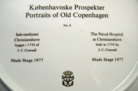 Platter fra Royal Copenhagen med motiver af Københavnske prospekter. Serien 'Københavnske prospekter' består af 12 platter/tallerkner, som hver især viser et motiv af et betydningsfuld historisk bygningsværk beliggende i København. Motiverne er tegnet af Mads Stage i 1977.
