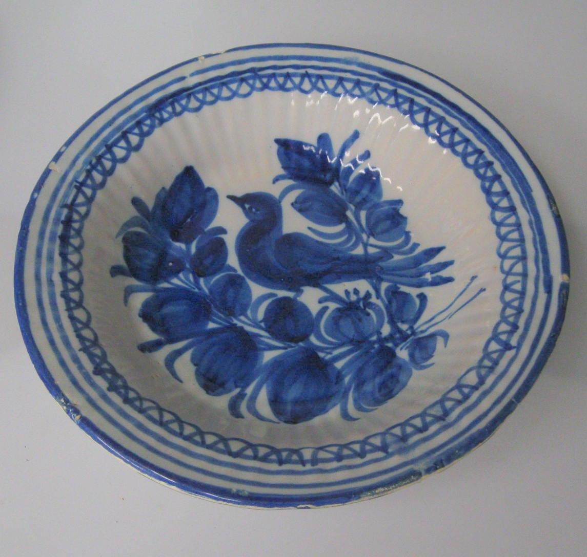 Fransk fajance skål, 1800-tallet. Lys begitning med blåmaling af en fugl på en gren. Skålen er hvælvet og rillet. Dia.: 26,5 cm. H.: 4,8 cm. Skålen er klinket.