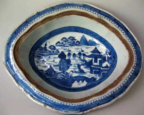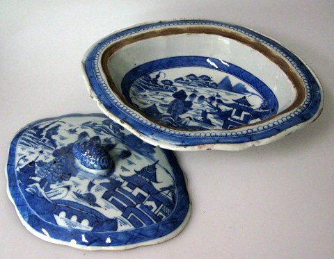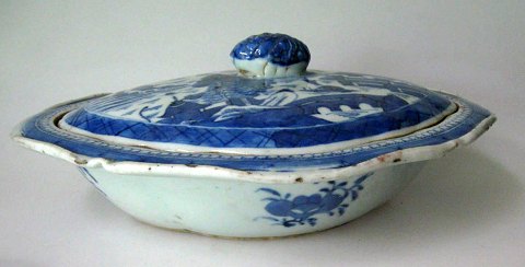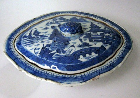 Kinesisk blåmalet terrin med låg, o. 1800. Grålig skærv med blålige overbemalinger i form af landskaber. Bølget kant. Med dekoration i bund. Helt intakt. På låget en lågknop i form af en kogle. Dekorationer på siderneL.: 26 cm. B.: 21,5 cm. H.: 8 cm.