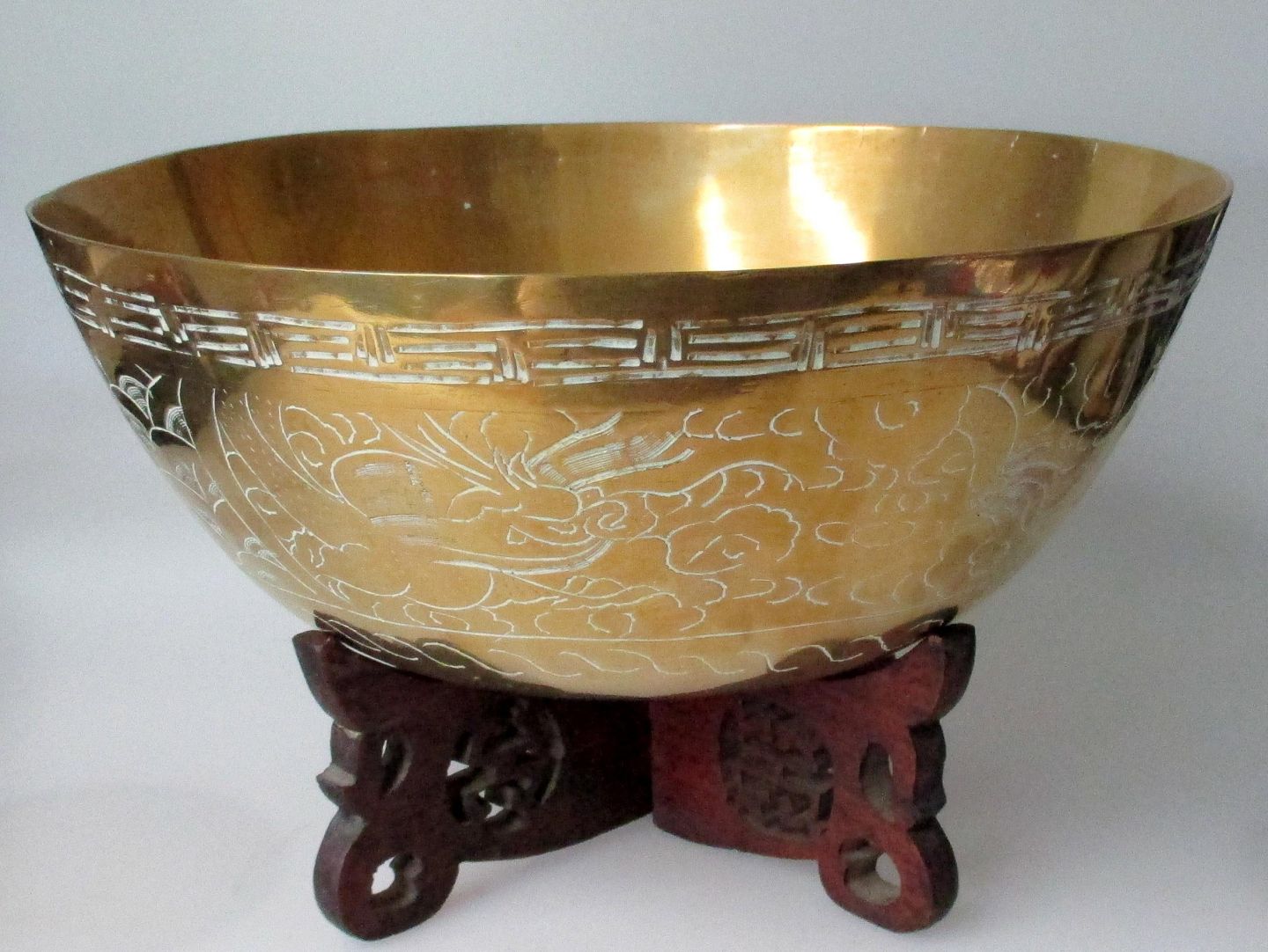 Kinesisk messingbowle, 19/20. årh. Dekoration på siderne i form af drager. Stemplet i bunden. Højde.: 10,5 cm. Dia.: 25,5 cm. På en træfod med skæringer.