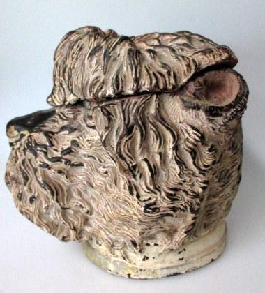 Bemalet rød lers tobaks krukke i form af hunde hoved. 19. årh. Med løst låg. Stemplet i bunden med produktionsnummer: o8/451. H.: 17,5 cm.