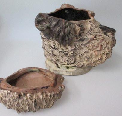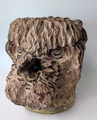 Bemalet rød lers tobaks krukke i form af hunde hoved. 19. årh.