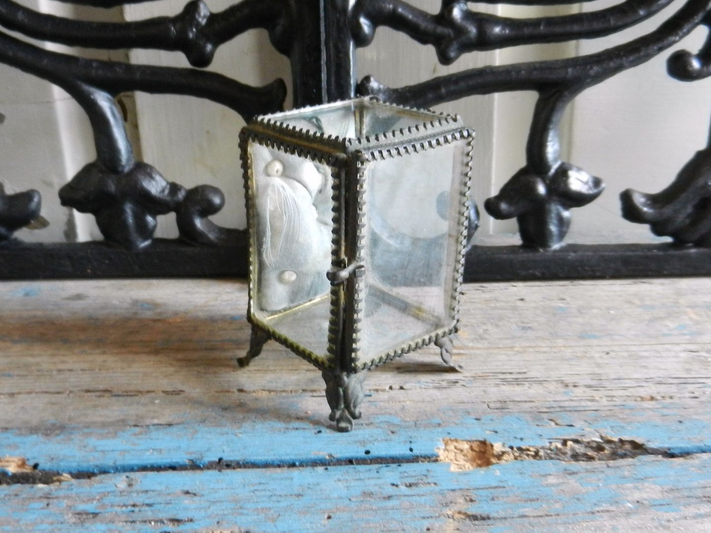 Skønt gammelt fransk glas skrin, fremstår med original silke pude.