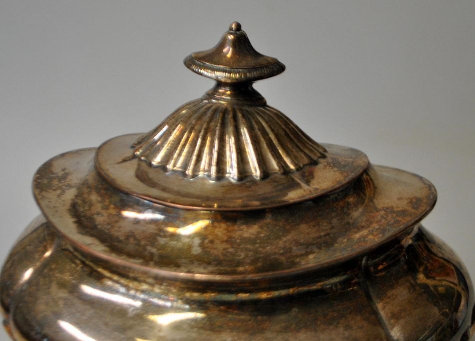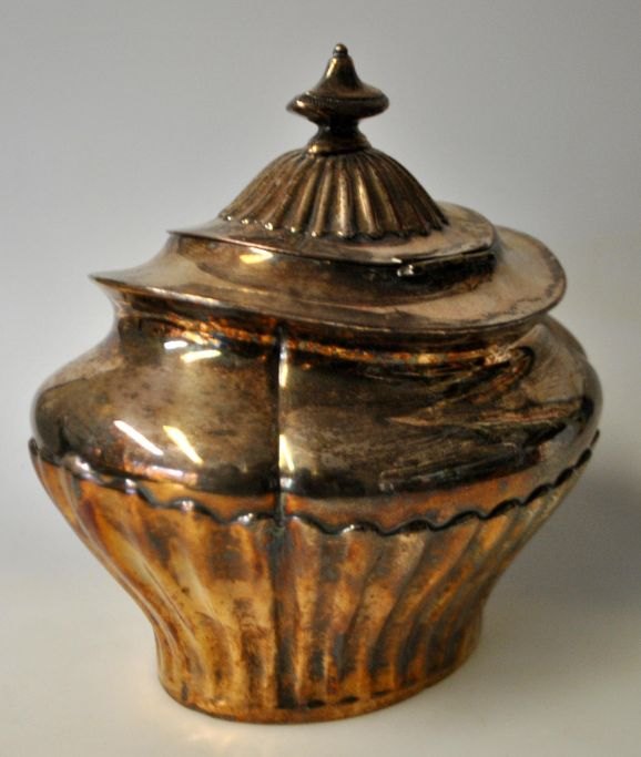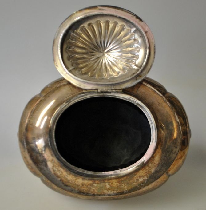 Antikt engelsk tedåse, o. 1900. Forsølvet kobber. Skævknækket rococo stil. Ingen synlige stempler. L.: 16 cm. H.: 15 cm.
