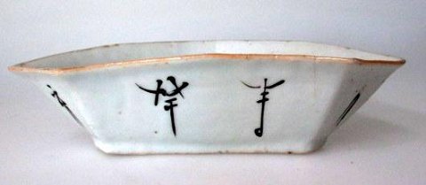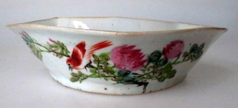 Kinesisk famille rose porcelæns skål i "engle" form, 19. årh. Ching Dynastiet, Tung Chih 1862 - 1875. Grålig procelænsmasse med håndmalede dekorationer af fugl på en gren. Stemplet. L.: 18 cm. B.: 10 cm. H.: 5 cm. Med skrifttegn. Med varen følger original dokument for udførsel fra Hong Kong fra 1989.