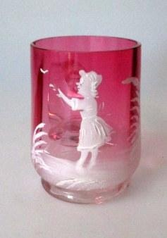 Antikt Bøhmisk rødligt glas med emaljedekoration, 19. årh. Mary Gregory. Hvidt dekoration med pige og sommerfugl. Optisk drevet. H.: 7 cm.