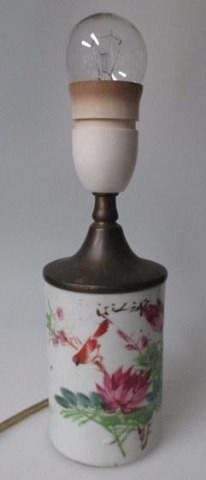 Chinese brush cup in porcelain, 19th century. Polychrome decoration with bird on a branch. With text. Stamped in the bottom. Reverted to electric lamp. H .: 10.5 cm.
