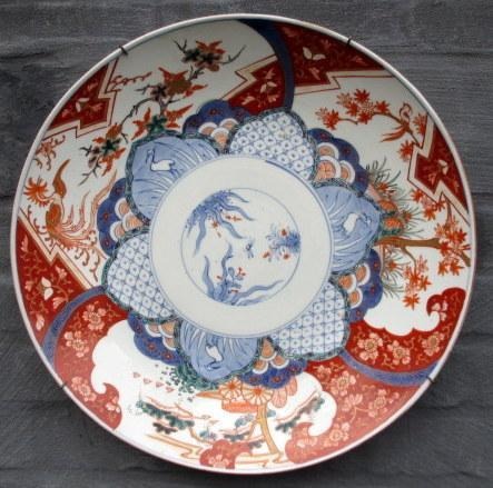 Et par store Imari fade i porcelæn, Japan, 19. årh. Næsten identiske. Dia.: 40 cm. Dekoration i blåt, rønt, rødt og forgyldninger. Dekoration med blomster, fugle og insekter. Ligeledes med dekoration i form af blomster på fanen.