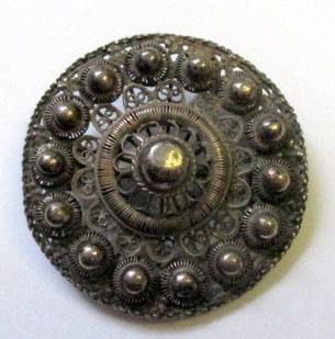 Filigran brosche i sølv, o. 1900. Dia.: 4,8 cm Ingen synlige stempler. Antagelig hollandsk fra provninsen Zeeland, hvor man kalder den "zeeuwse knop". Tak til kunde for information.