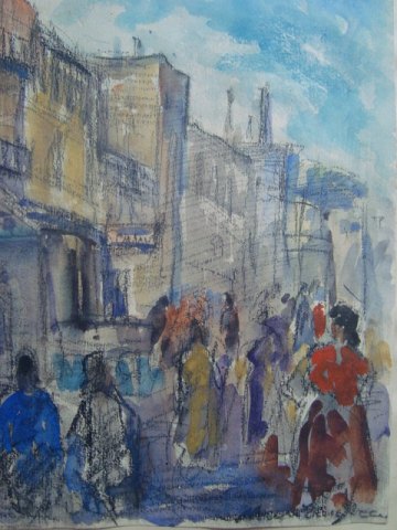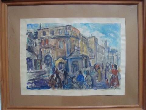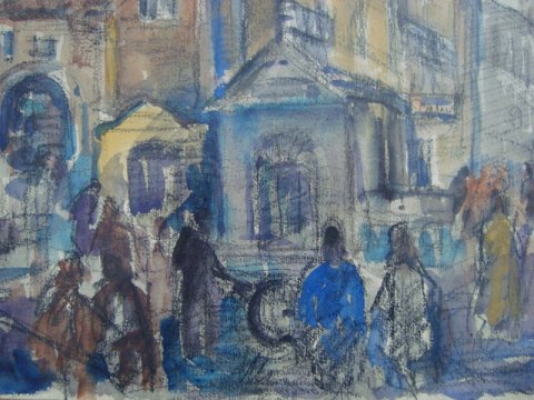 Akvarel af Aksel Lundgreen - Folkeliv, Paris 1952.