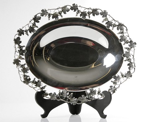 Sølvkagefad på fødder, omkranset af vinstokke.