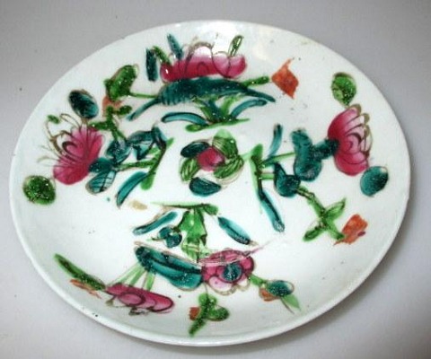 Chinese bowl, 19th century. Famille Rose. Grayish porcelain, decorated with flowers in green and red. H .: 2 cm. Dia .: 13.5 cm. Signed. Provenance: Danish Commander.