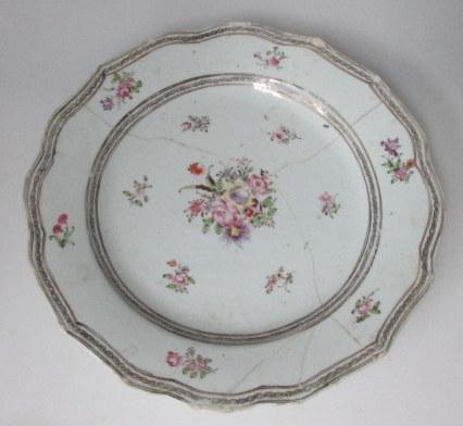 Ost indisk tallerken, 18. årh. Kinesisk famille rose tallerken. Med flæset kant. Bemalet med strø blomster både på spejl og fane. Repareret. Dia.: 24 cm.