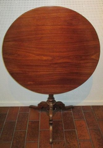 English tripod table, tea table, c. 1800, with the "bird cage", in mahogany. Three Capriole legs, baluster column and round plate. H .: 75 cm. Dia .: 73 cm.