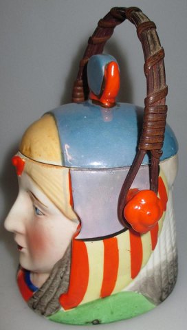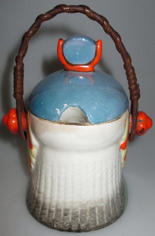 Jam Jar, around 1920. In the form of Egyptian woman - possibly Cleopratra. Polychrome decoration. Hand painted. With bast handle. Lid in the form of hat. At the bottom signed B. Foreign. H .: 11.5 cm. Perfect condition - nice piece!