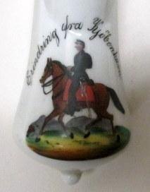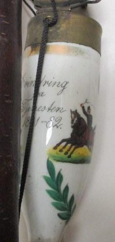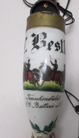 Soldater pibe, tilhørende C. Bestle, fra tjenesten i København 1881 - 1882. Pibe hoved med bemalet kanonlavet med seks heste forspændt. Med teksten: C. Bestle, Trainkonstabel v. 1ste Batterie No. 367. Erindring fra tjenesten: 1881 - 1882. Erindring fra Kjøbenhavn. Skæft i birketræ og hornspids. L: 80 cm. Delvist bemalet. C.W.F. Bestle var vinhandler og konsul i Aarhus.
