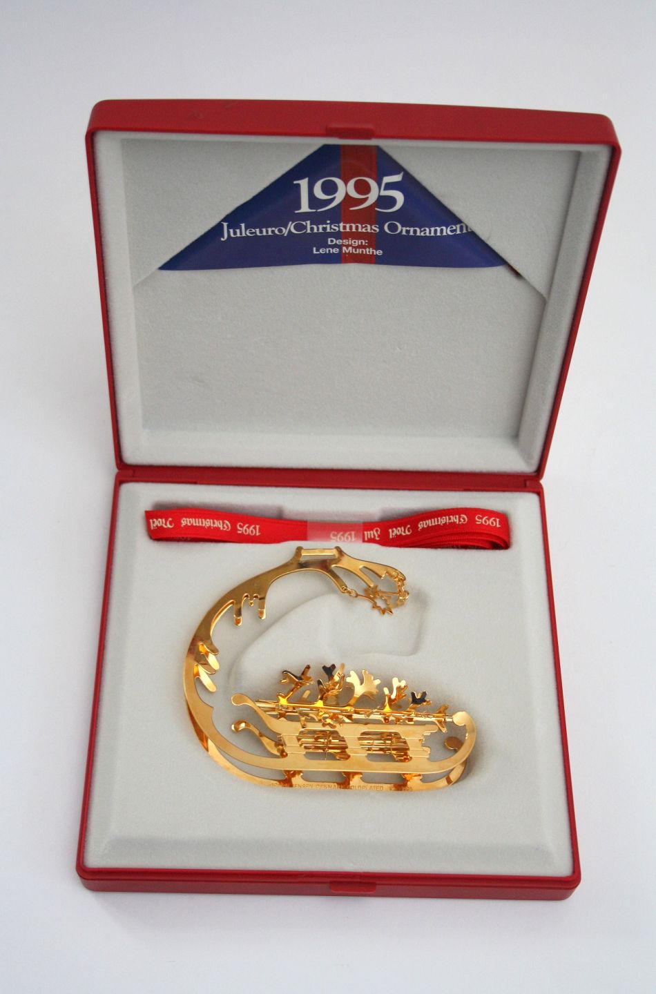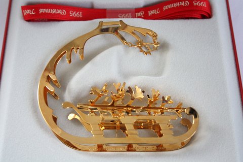 Georg Jensen, juleuro 1995, Juleslæde designet af kunstner Lene Munthe. Juleuroen er udført i messing belagt med 24 karat guld. Originalt rødt silkebånd og gaveæske medfølger. Pæn og velholdt stand. Pris: 600 kr. stk. Lager: 2