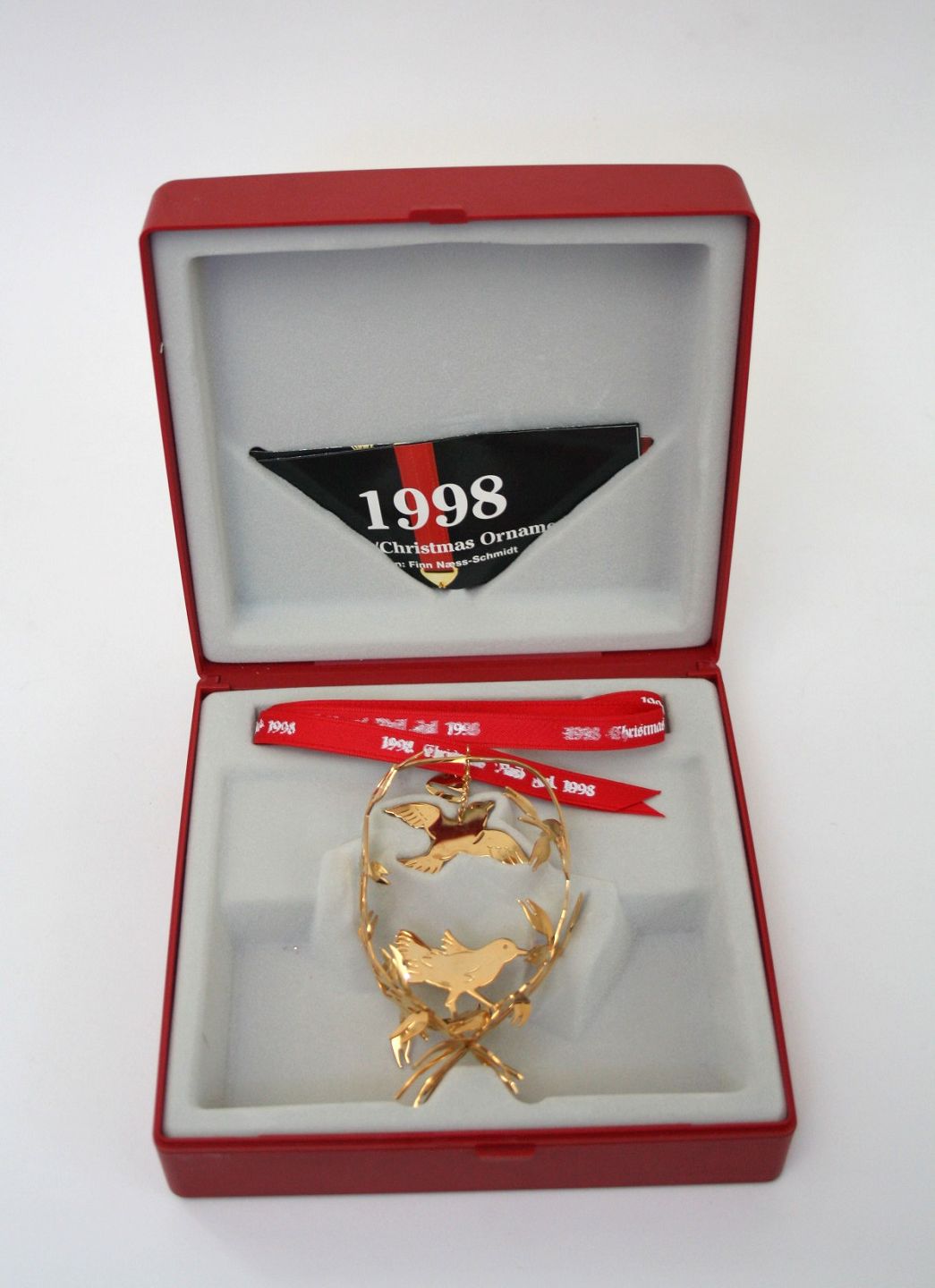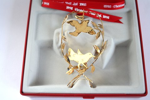 Georg Jensen, juleuro 1998, Juleneget designet af kunstner Finn Næss-Schmidt. Juleuroen er udført i messing belagt med 24 karat guld. Originalt rødt silkebånd og gaveæske medfølger. Pæn og velholdt stand. Pris: 600 kr. stk. Lager: 4