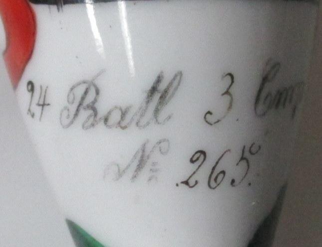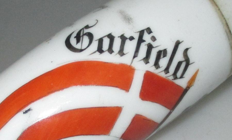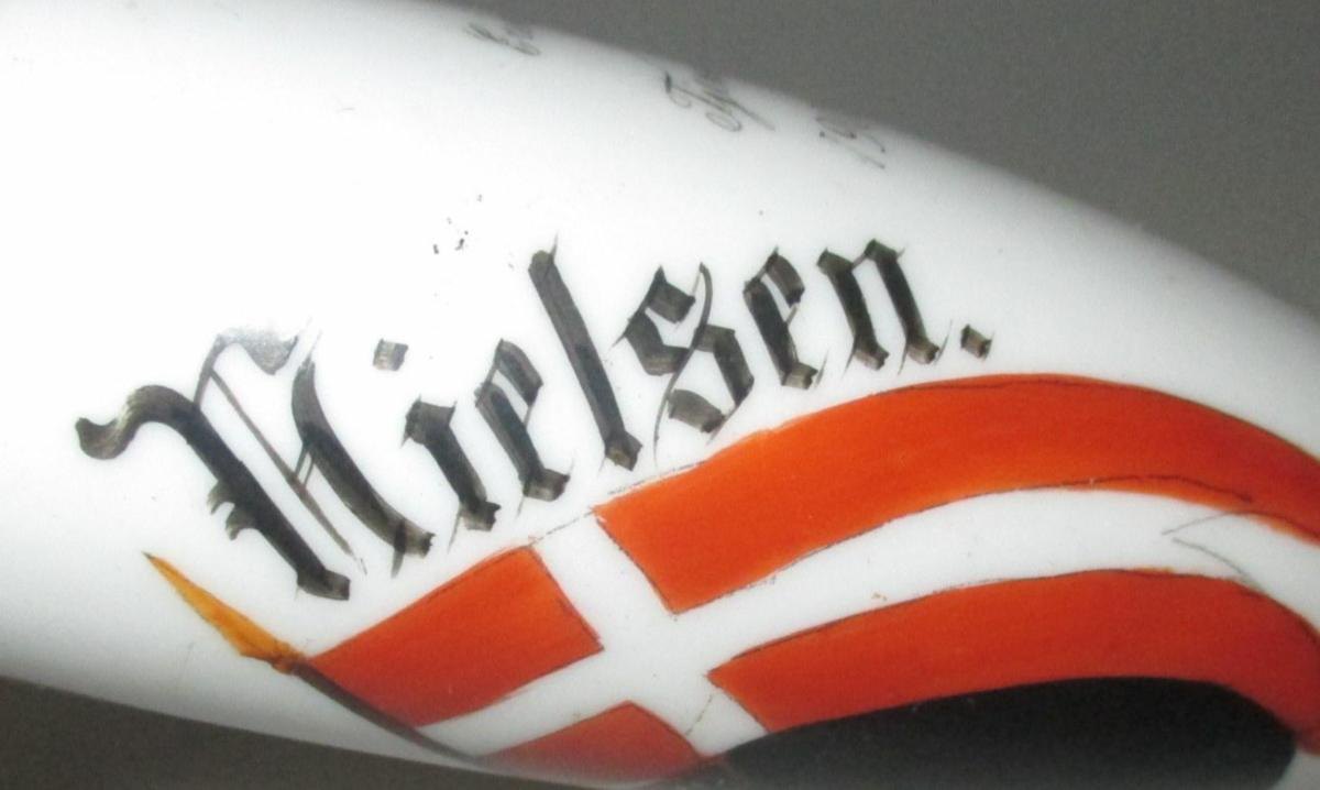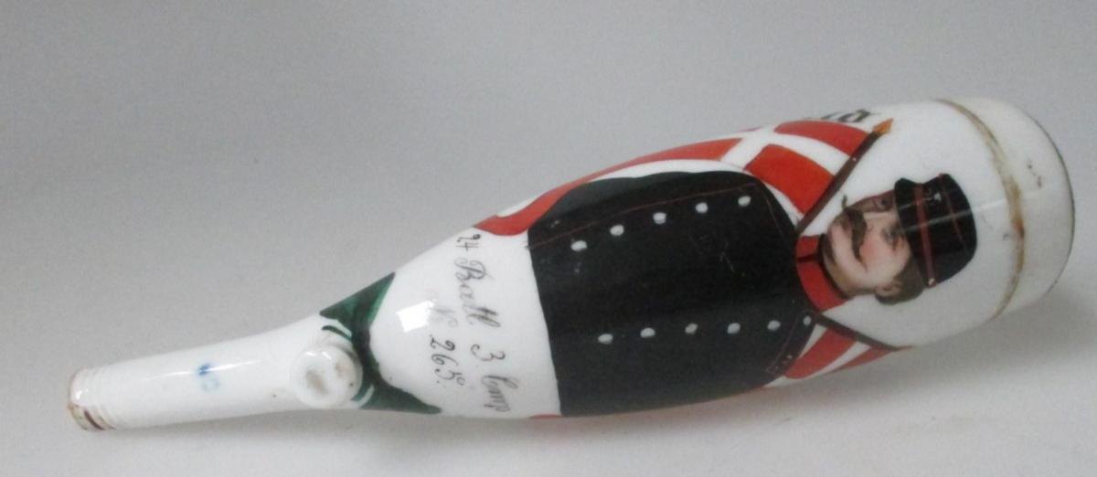Soldater pibe hoved i porcelæn, 1905 - 1906, Danmark. Delvis hånd bemalet. Med navnet: Garfield Nielsen, til erindring fra tjenesten 1905 - 1906. 24 Batl. 3 Comp. L.: 17 cm. Garfield Nielsen blev født den 17. sep. 1884. I 1930 boede han i Grashave, Maribo Amt, på Lolland, hvor han var bestyrer af fattiggården. (MyHeritage)