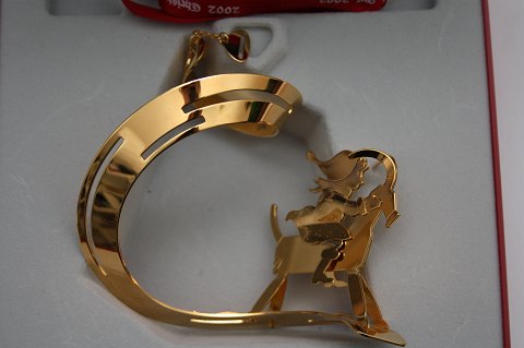 Georg Jensen, juleuro 2002, Juletravlhed designet af kunstner Finn Næss-Schmidt. Juleuroen er udført i messing belagt med 24 karat guld. Originalt rødt silkebånd og gaveæske medfølger. Pæn og velholdt stand. Pris: 450 kr. stk. Lager: 3