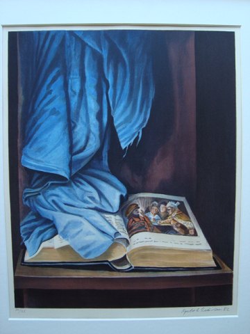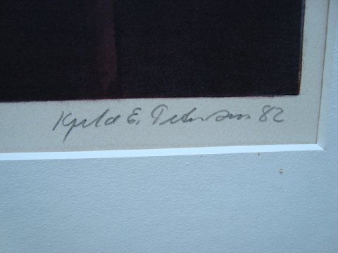 Farvelitografi af Kjeld E. Petersen 1982 - Opstilling på bord.