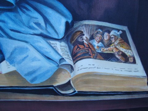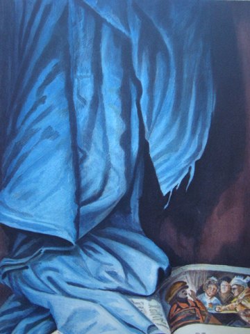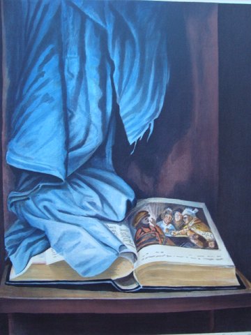 Opstilling med bog på bord og flænset gardin 1982.
