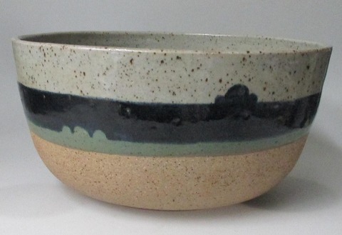 Munkgaard, Lone (1938 - ) Danmark: Bordskål. Keramik med overglasurer i grøn, blåt og grå. Dia.: 25 cm. H.: 12,5 cm. Stemplet.