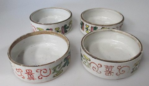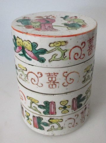 Chinese antique porcelain fourlayer food container, 19th century. Famille rose. Decorated with floral and characters with double happiness. On the lid decoration with 5 people. Polychrome decoration. H .: 11.5 cm. Dia .: 8.5 cm. With effect follows export papers and a certificate from Hong Kong 1979.