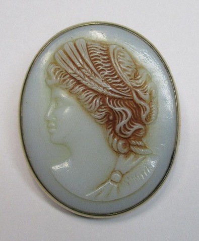 Camé, 20. årh. Udarbejdet i konkylie. Dekoration med kvinde i profil. Indfattet i oval sølvmontering. Stemplet.: 925 s. og mestermærke: EJü. H.: 3,5 cm. B.: 2,7 cm.